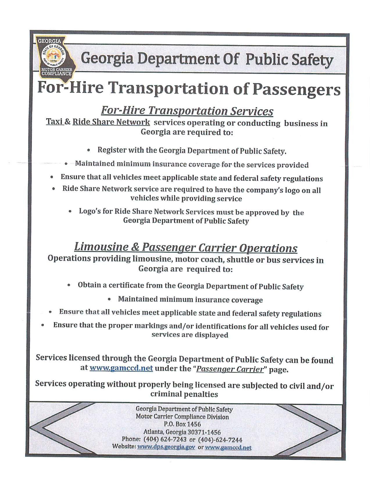 We would like to provide you with important information regarding registration, certificate of permit, application, etc. Please see flyer below issued by the Georgia Department of Public Safety. All information can be found on the Department's regulatory website at www.gamccd.net