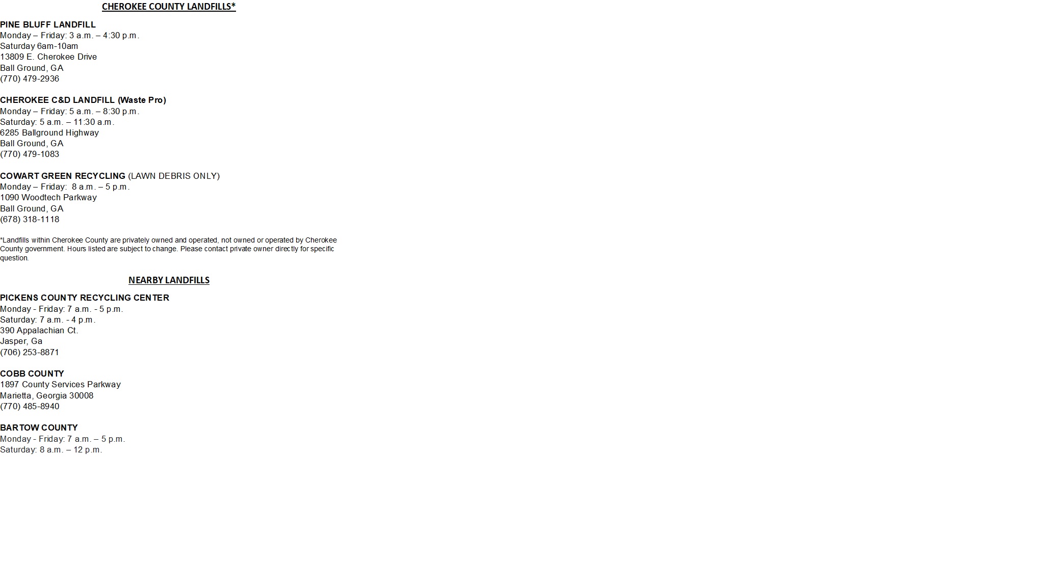 There are two privately owned landfills operating in Cherokee county.